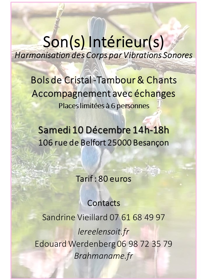 Durant cet atelier, chaque immersion (aux bols puis au tambour) sera suivie d’un temps d’expression sur le vécu individuel et d’un échange sur les modifications vibratoires perçues pour bâtir une compréhension des libérations à l’œuvre et prendre consciemment la mesure de l’effet de ré-harmonisation de ces bains sonores sur ses corps physique et éthérique.