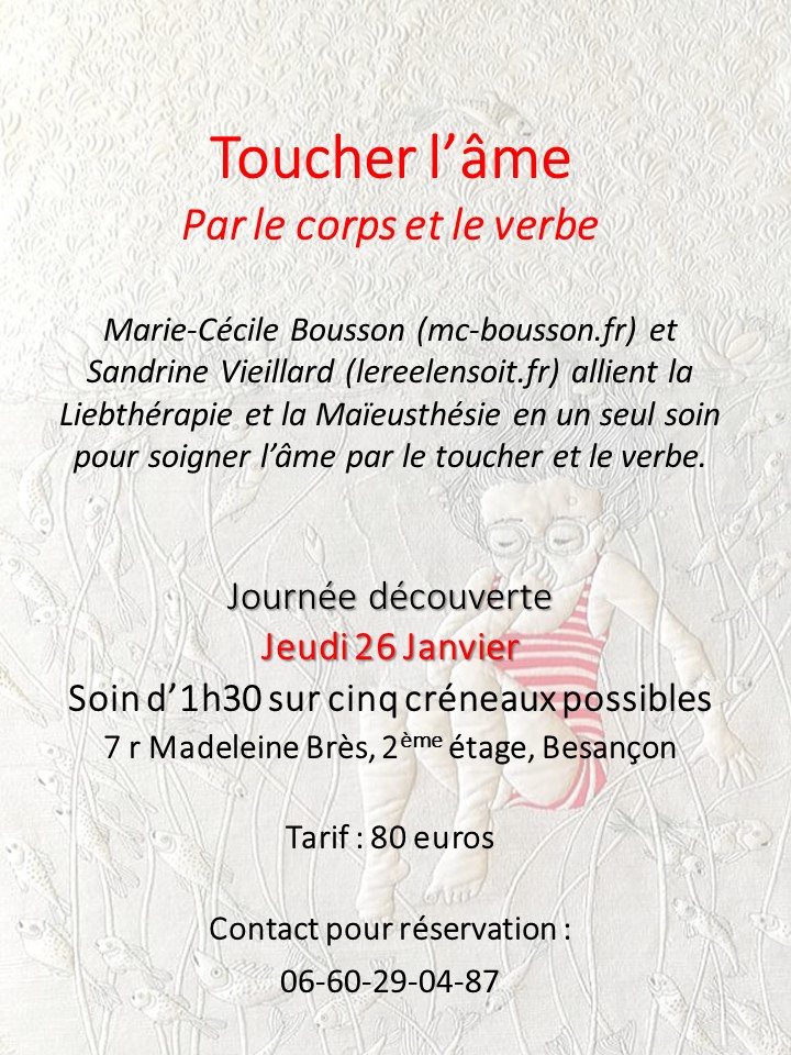 Marie Cécile Bousson et moi-même nous associons pour proposer un soin intégral de l’âme par le toucher et le verbe en alliant Liebtherapie et Maïeusthésie. Cette alliance vise une descente douce et profonde dans l’essence du réel en soi. La Leibthérapie accompagne avec un toucher subtil et de toute présence pour être plus en lien avec « le corps que nous sommes ». La Maïeusthésie est un accouchement de soi par les ressentis dont l’expression est la manifestation « d’êtres » intérieurs qui appellent pour être reconnus dans leur fonction de cohésion interne afin de créer, par une alchimie psychique et corporelle, une unité de la personne. Cinq créneaux sont possibles : 8h30 – 10h30 – 13h (réservé) – 15h et 17h.